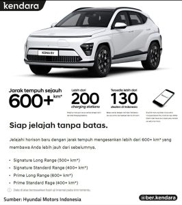 Mobil Hyundai Full Listrik telah hadir di Indonesia, sebagai pemain baru yang menggabungkan SUV elektrik compact, gagah, lapang dan memiliki jarak tempuh yang Fantastis.